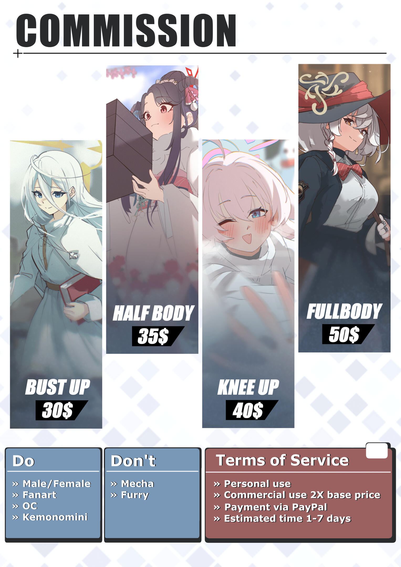 ⟫ I have the right to refuse your commission request when I feel it is beyond my drawing ability.⟫ I reserve the copyright of my works and the right to publish them onto my portfolio and my social media.⟫ Please do not use my art as a reference for AI art prompt. I do not support AI art and will not argue/reconsider.⟫ *I only receive payment through PayPal or with Ko-FI *⟫ I don't accept any clients that bargain for cheaper prices. Please give me support by not bargaining prices with me⟫ Major changes can only be made during sketch phase (If you want change the whole art and it's 1x only)⟫ Buyer cannot ask me to refund if it is under sketch